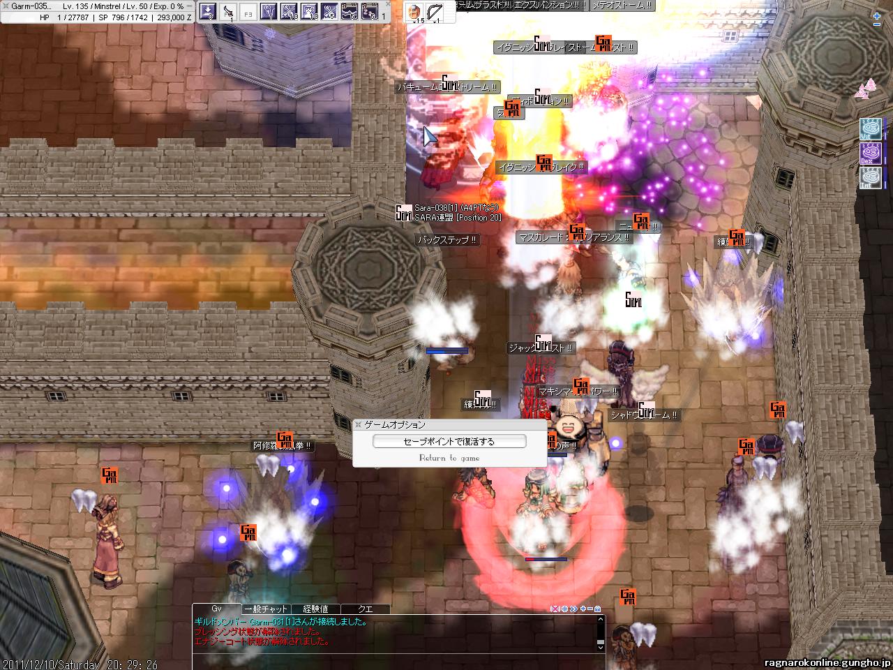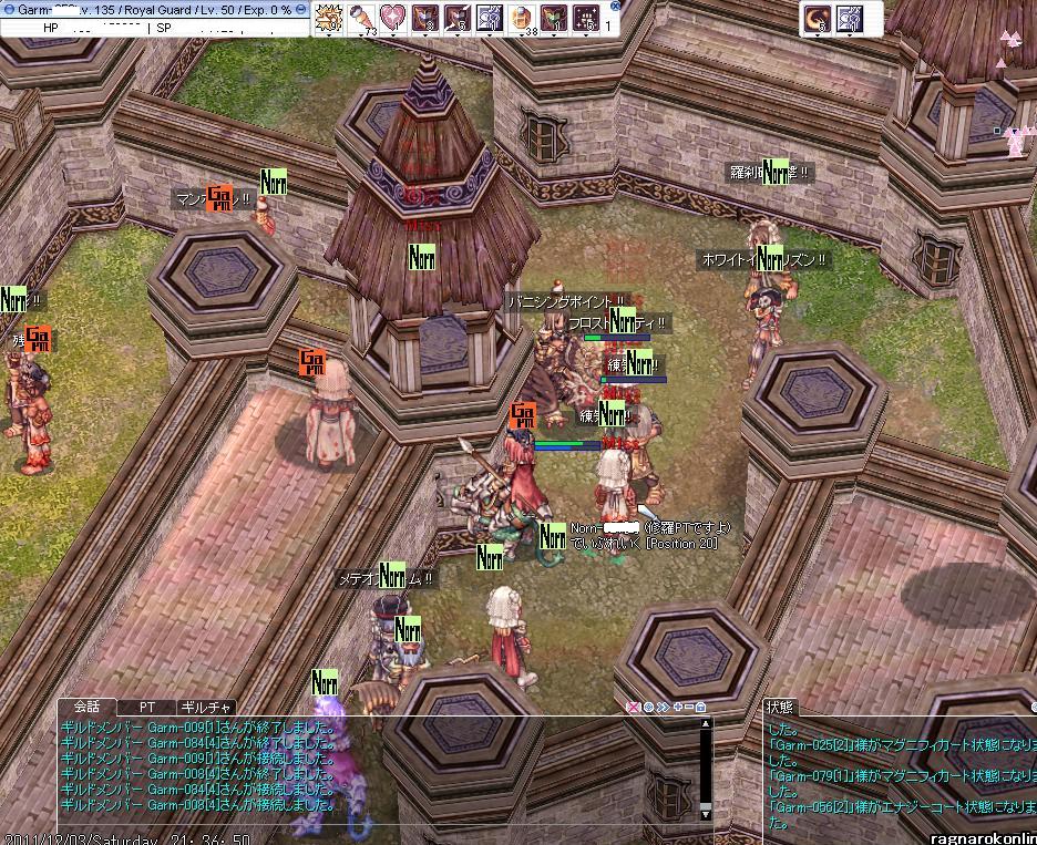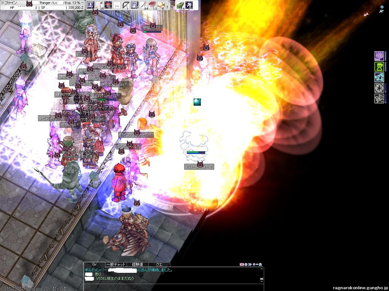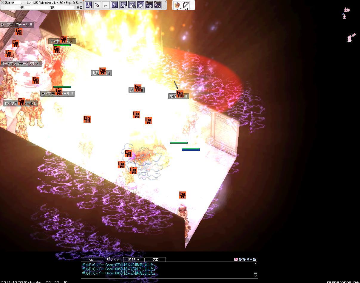 地元のスキー場も17日にオープン予定・・・!楽しみだなぁ・・・。 前日に鯖対抗Gvもあってか若干みんなお疲れ気味。 通常GvのほうはV地方を色々まわっていたのですが、途中から人が一気に居なくりました。 これはSEで戦闘してるのかなー?と思い、偵察をだしました。 F4だったかな?そこで 防衛側 塾Del vs 攻撃側 熊OSK の構図でした。(他にもGいたかもしれない・・・!間違えてたらすいません。) DWCも攻めで参加。熊OSKとも同盟を組んで突撃!しかし既に終盤戦で、3バリケ破壊の途中のようでした。この後牛丼に参加してF4からは撤退。 |